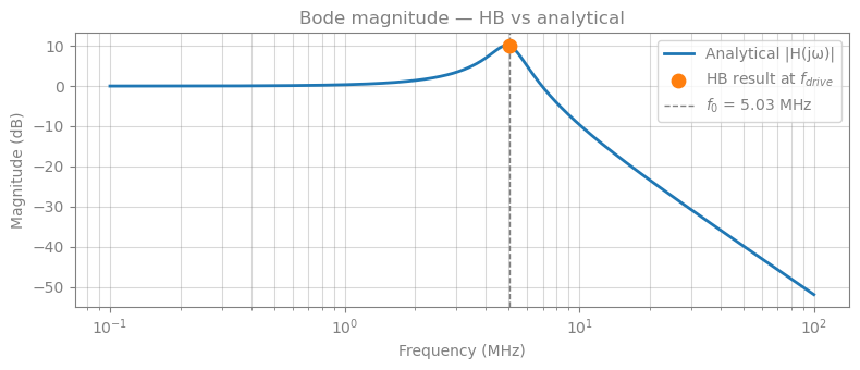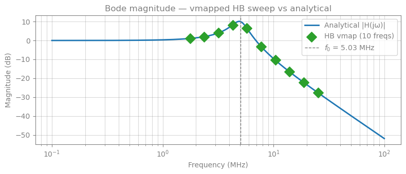 - Series LCR resonator — a linear benchmark. HB recovers the resonance peak and is validated against the analytical transfer function.