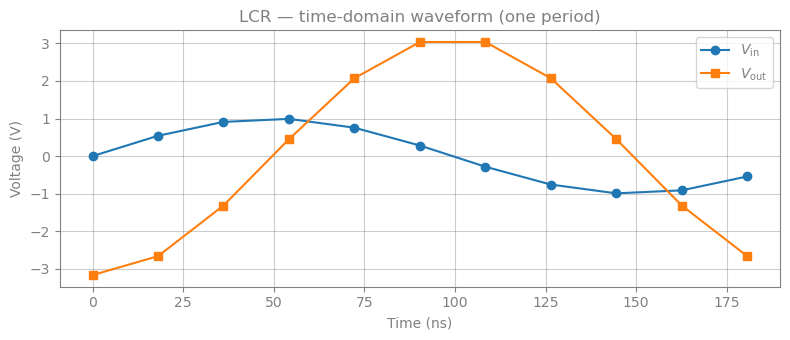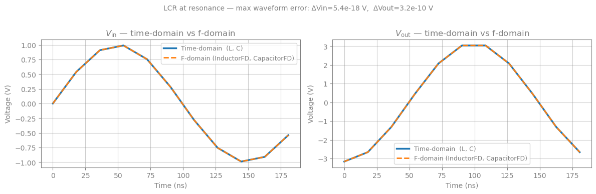 f"LCR at resonance — max waveform error: ΔVin={max_err_in:.1e} V, ΔVout={max_err_out:.1e} V",