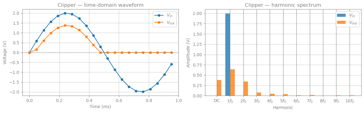 - Diode half-wave clipper — a nonlinear circuit. The clipped waveform generates harmonics at \(2f_0\), \(3f_0\), … that are captured by HB.