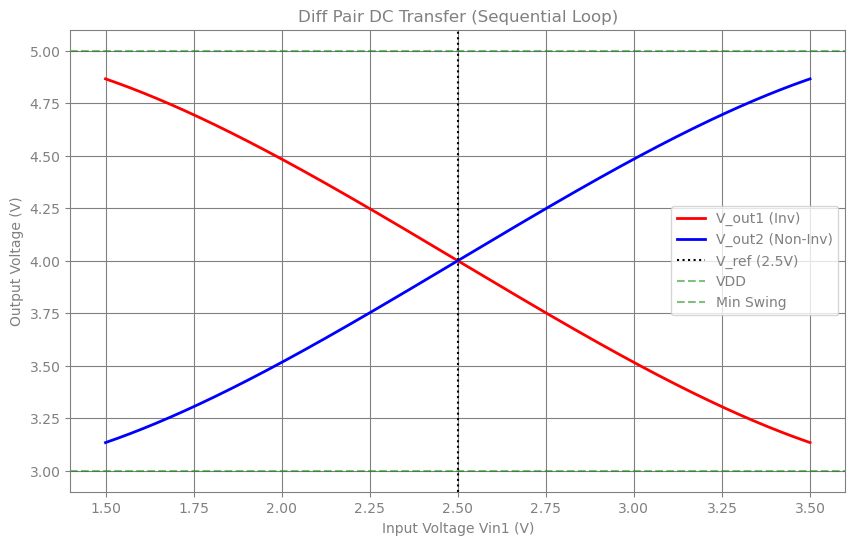 In this section, we analyze the MOS Differential Pair, the fundamental input stage of operational amplifiers and logic gates. The circuit consists of two matched NMOS transistors (\(M_1, M_2\)) sharing a common "tail" current source (\(I_{SS}\)).We will perform a DC Transfer Analysis, sweeping the input voltage \(V_{in1}\) from \(1.5V\) to \(3.5V\) while holding \(V_{in2}\) constant at \(2.5V\). This simulation reveals how the tail current steers between the two branches, creating the characteristic sigmoidal differential output.