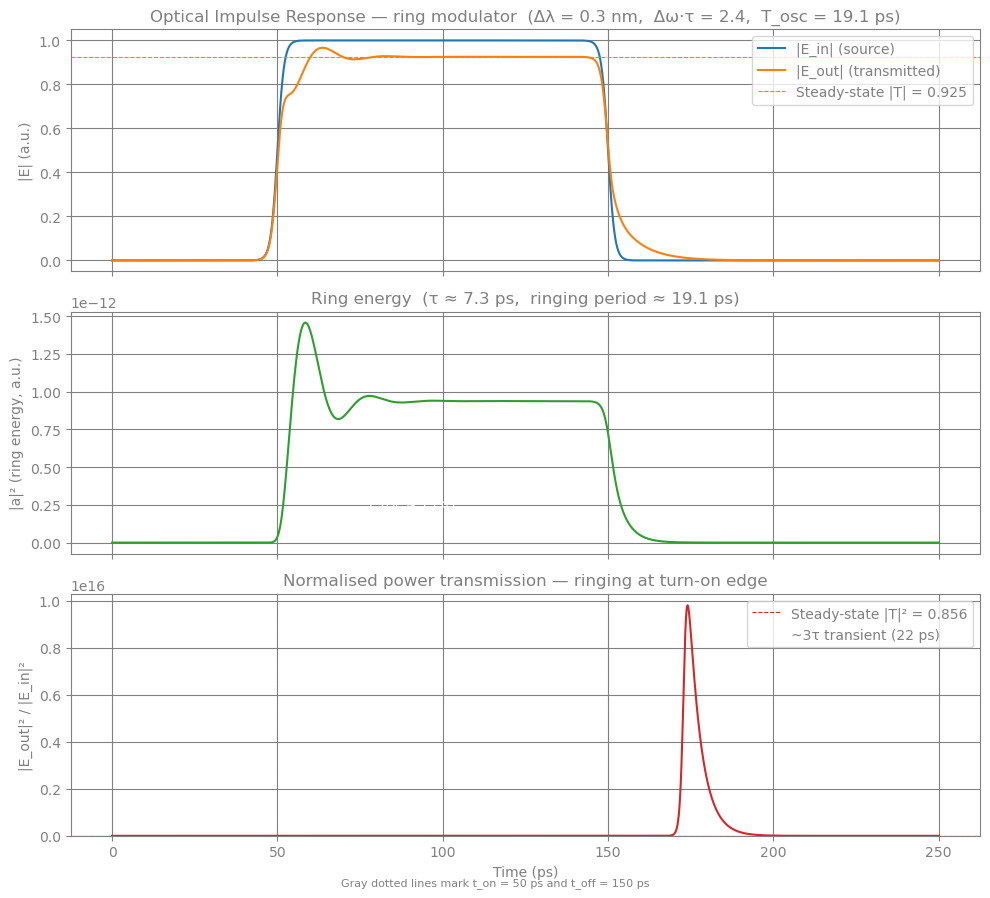 This notebook simulates the transient optical response of a ring resonator modulator using Temporal Coupled-Mode Theory (t-CMT). An optical pulse is launched into a bus waveguide coupled to the ring. We observe how the ring energy \(a(t)\) builds up and decays, and how this shapes the transmitted field.