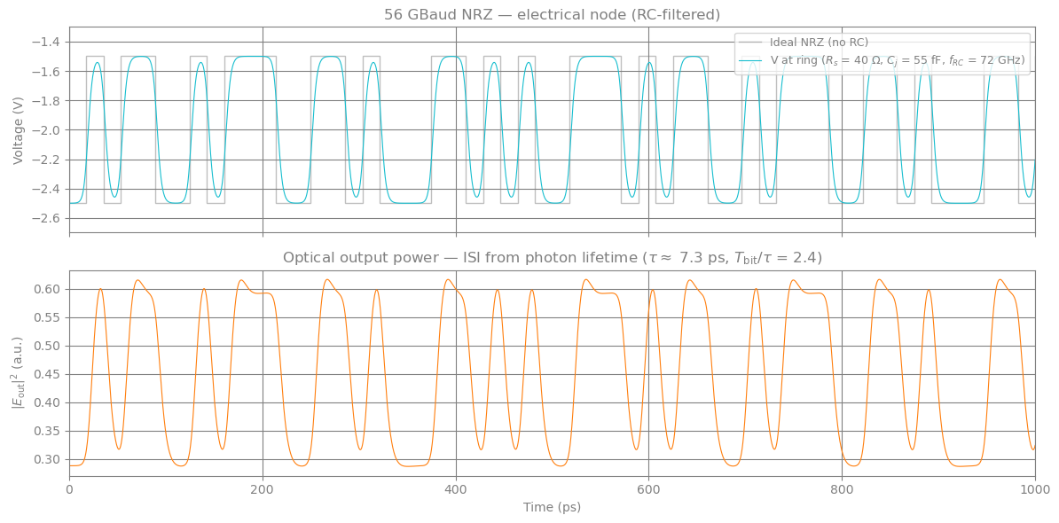 jax.vmapover frequency in a single JIT call. - Part 4 Large-signal NRZ eye diagram: 128-bit PRBS pattern at 56 GBaud reveals ISI from photon-lifetime memory.