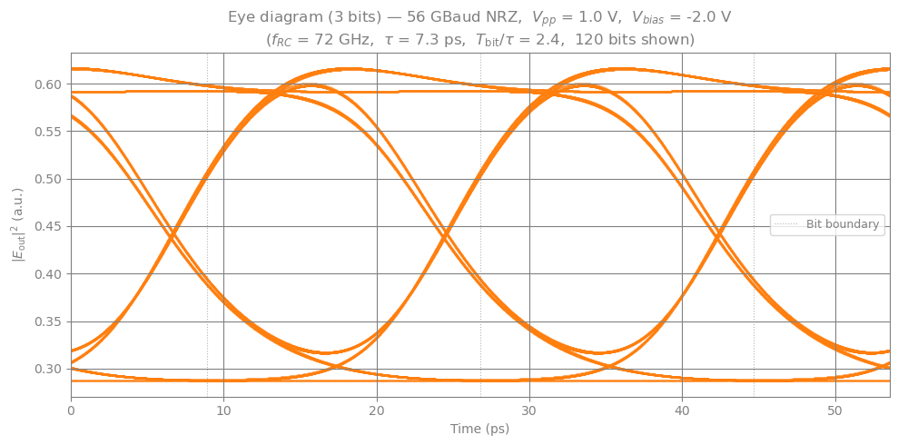 # ── Eye diagram (3 bits wide, auto-centred on optical crossing) ──────────────────────