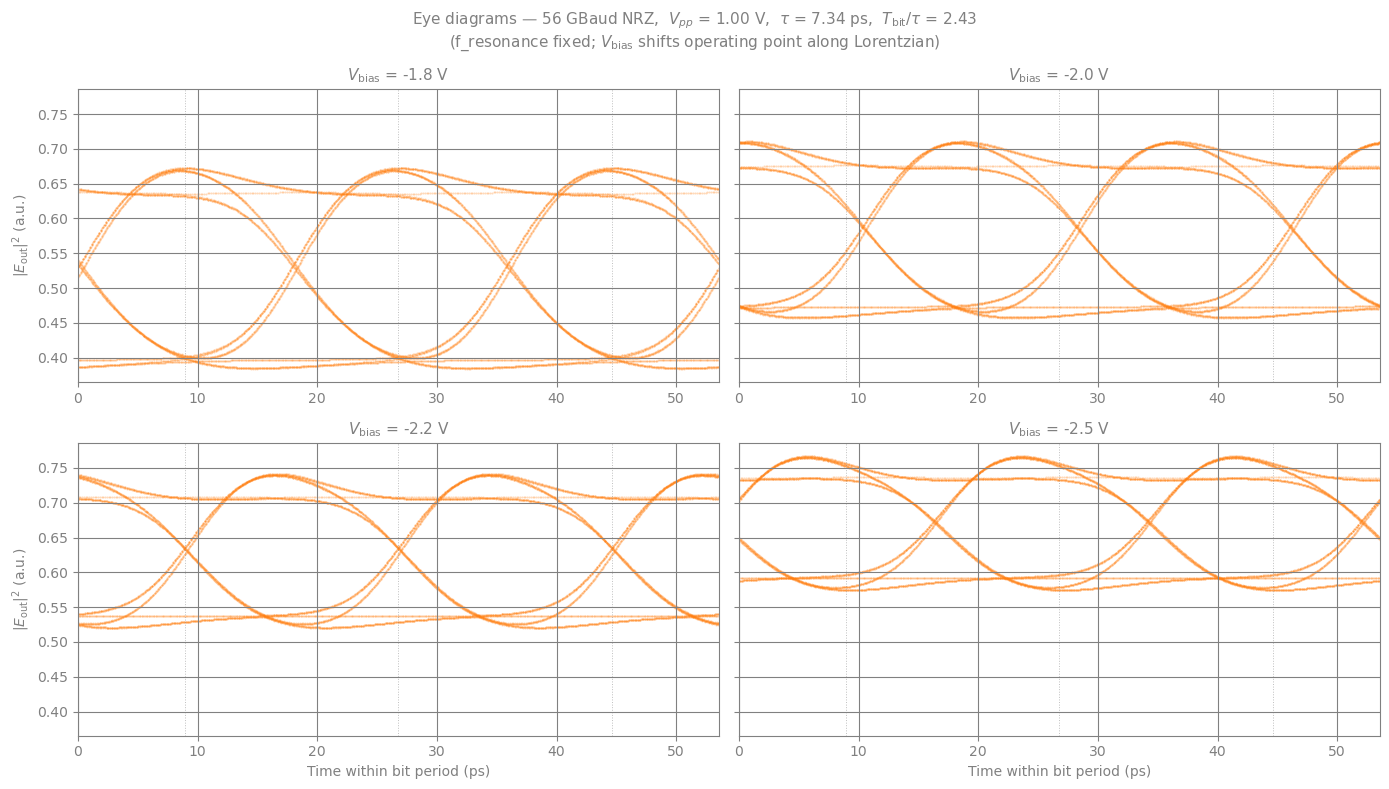 The four panels below show how the eye diagram changes as \(V_\text{bias}\) shifts the operating point along the ring Lorentzian: - Less negative bias → ring further from resonance → higher mean transmission, wider eye - More negative bias → ring closer to resonance → deeper modulation, stronger nonlinear ISI