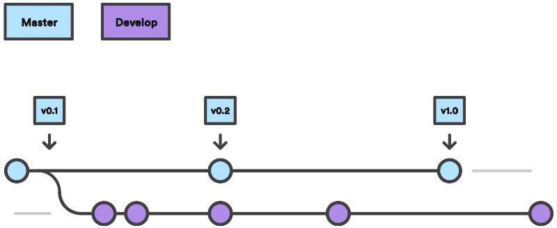 There can be multiple branches alive at any point in time; the working directory is the state of a special pointer called HEAD. In this example there are two branches, main and develop: