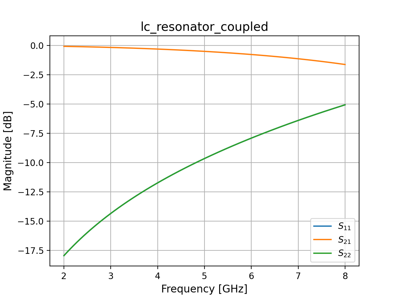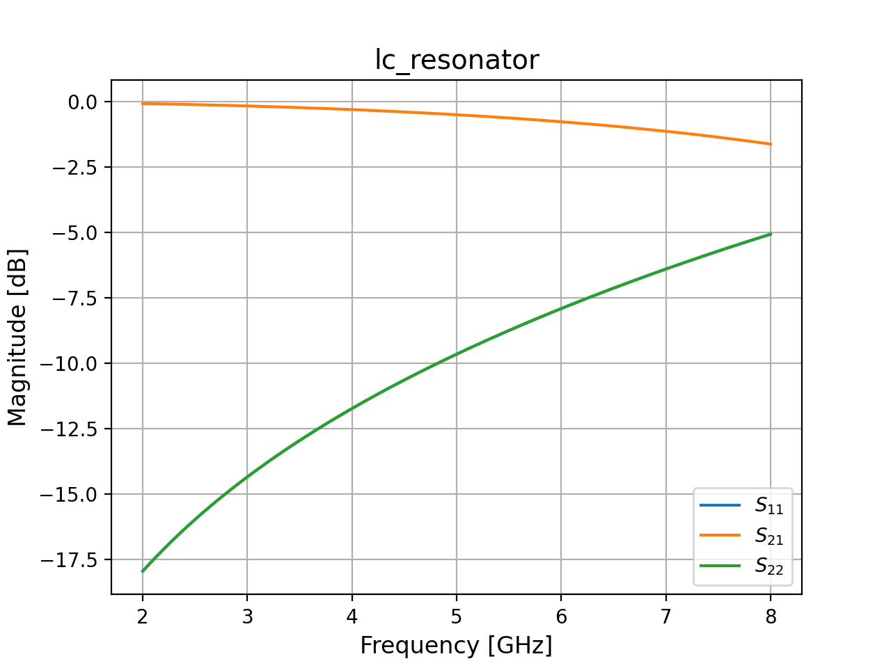 \[\begin{aligned} S_{11} &= \frac{A + B/Z_{\mathrm{ref}} - C\,Z_{\mathrm{ref}} - D} {A + B/Z_{\mathrm{ref}} + C\,Z_{\mathrm{ref}} + D} \\ S_{21} &= \frac{2} {A + B/Z_{\mathrm{ref}} + C\,Z_{\mathrm{ref}} + D} \end{aligned}\]When