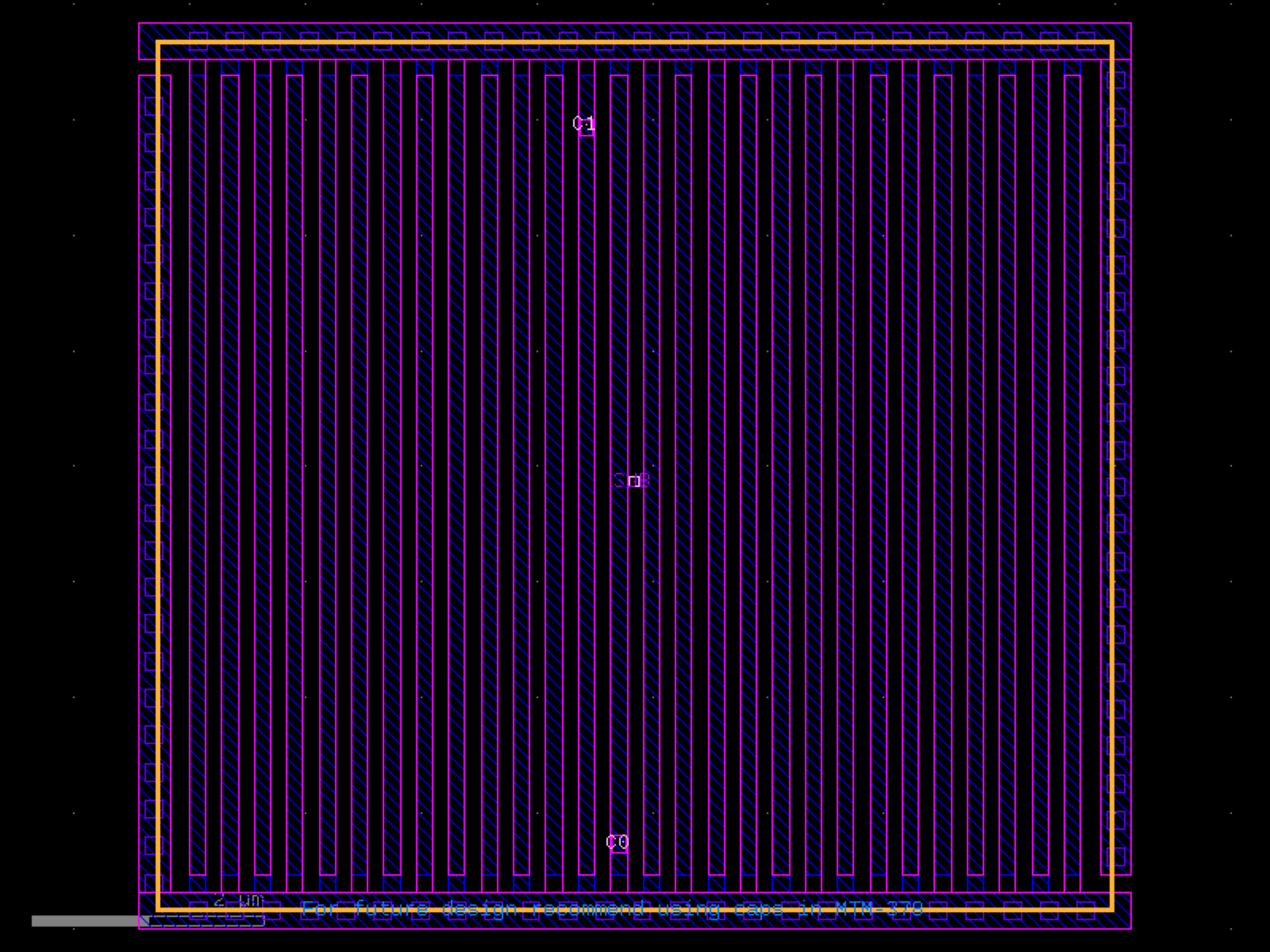 sky130.cells.sky130_fd_pr__cap_vpp_08p6x07p8_m1m2_noshield# sky130.cells.sky130_fd_pr__cap_vpp_08p6x07p8_m1m2_noshield()[source]# Returns sky130_fd_pr__cap_vpp_08p6x07p8_m1m2_noshield fixed cell. import sky130 c = sky130.components.sky130_fd_pr__cap_vpp_08p6x07p8_m1m2_noshield() c.plot() (Source code, png, hires.png, pdf) Return type: Component