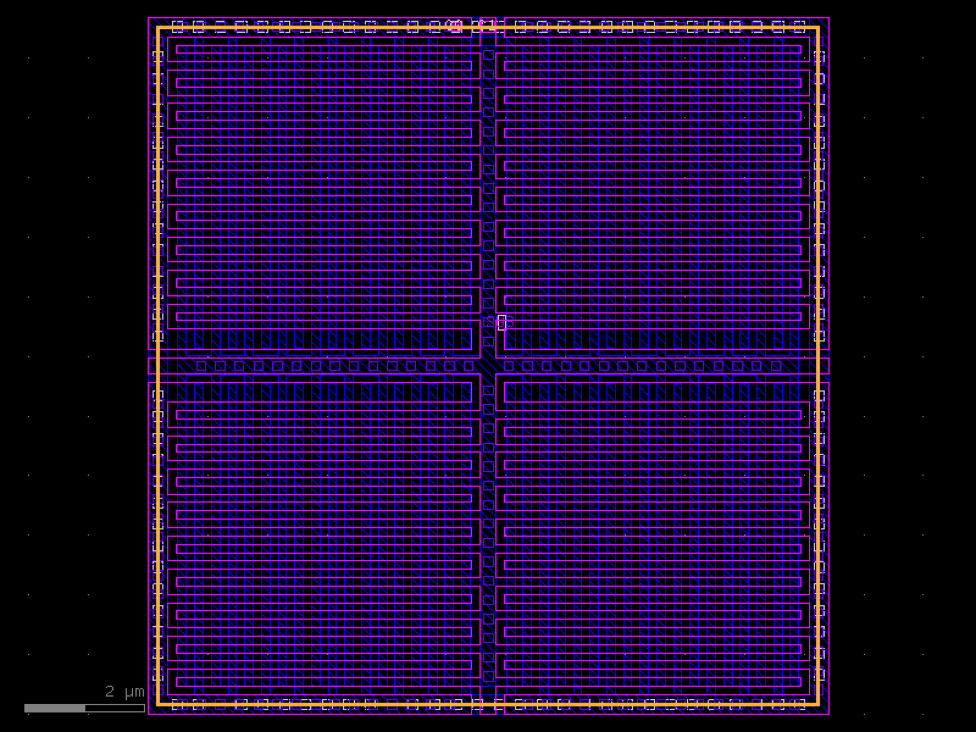 sky130.cells.sky130_fd_pr__cap_vpp_11p5x11p7_m1m2_shieldl1# sky130.cells.sky130_fd_pr__cap_vpp_11p5x11p7_m1m2_shieldl1()[source]# Returns sky130_fd_pr__cap_vpp_11p5x11p7_m1m2_shieldl1 fixed cell. import sky130 c = sky130.components.sky130_fd_pr__cap_vpp_11p5x11p7_m1m2_shieldl1() c.plot() (Source code, png, hires.png, pdf) Return type: Component