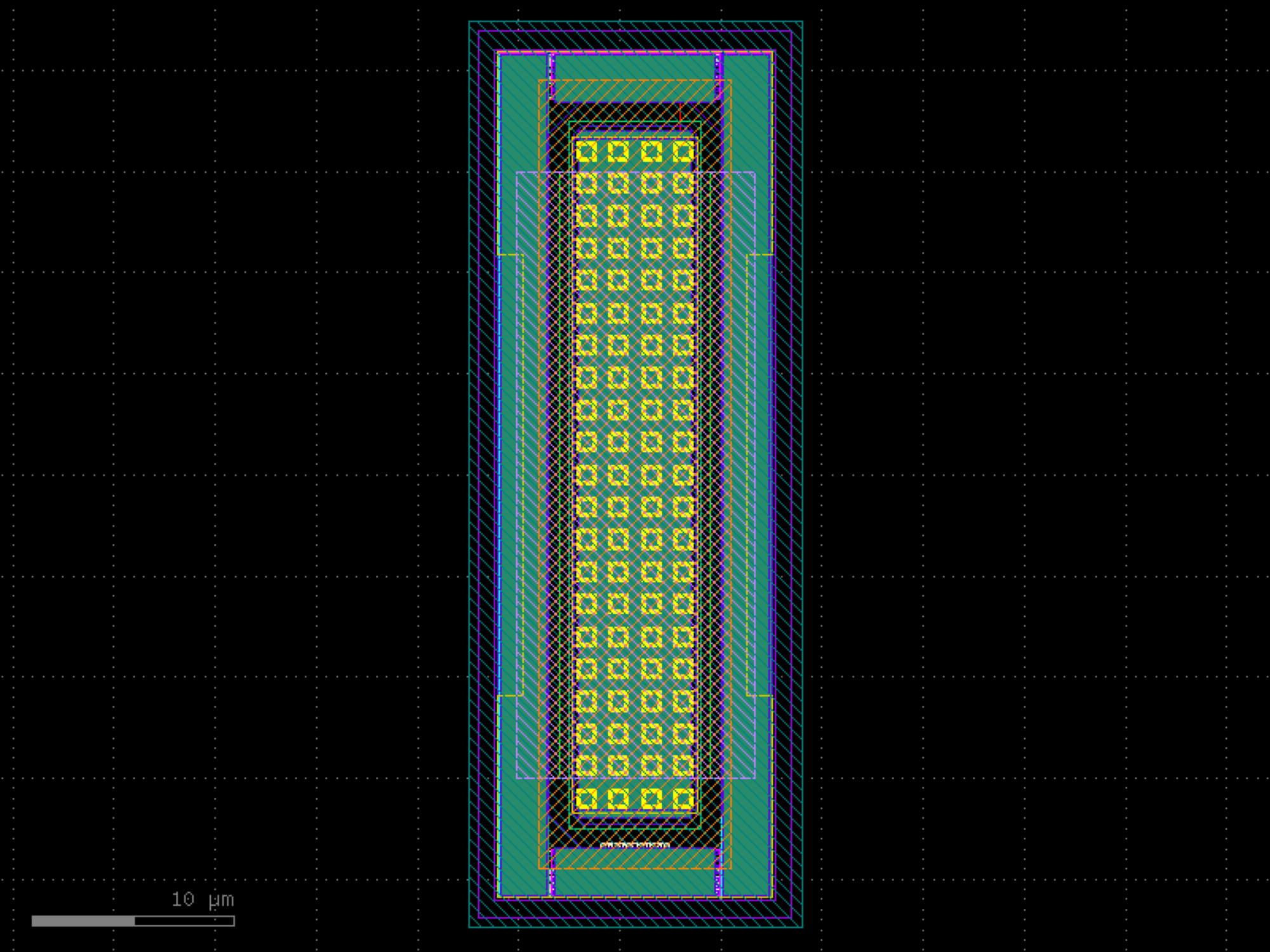 sky130.cells.sky130_fd_pr__esd_rf_nfet_20v0_iec_21vW60p00# sky130.cells.sky130_fd_pr__esd_rf_nfet_20v0_iec_21vW60p00()[source]# Returns sky130_fd_pr__esd_rf_nfet_20v0_iec_21vW60p00 fixed cell. import sky130 c = sky130.components.sky130_fd_pr__esd_rf_nfet_20v0_iec_21vW60p00() c.plot() (Source code, png, hires.png, pdf) Return type: Component