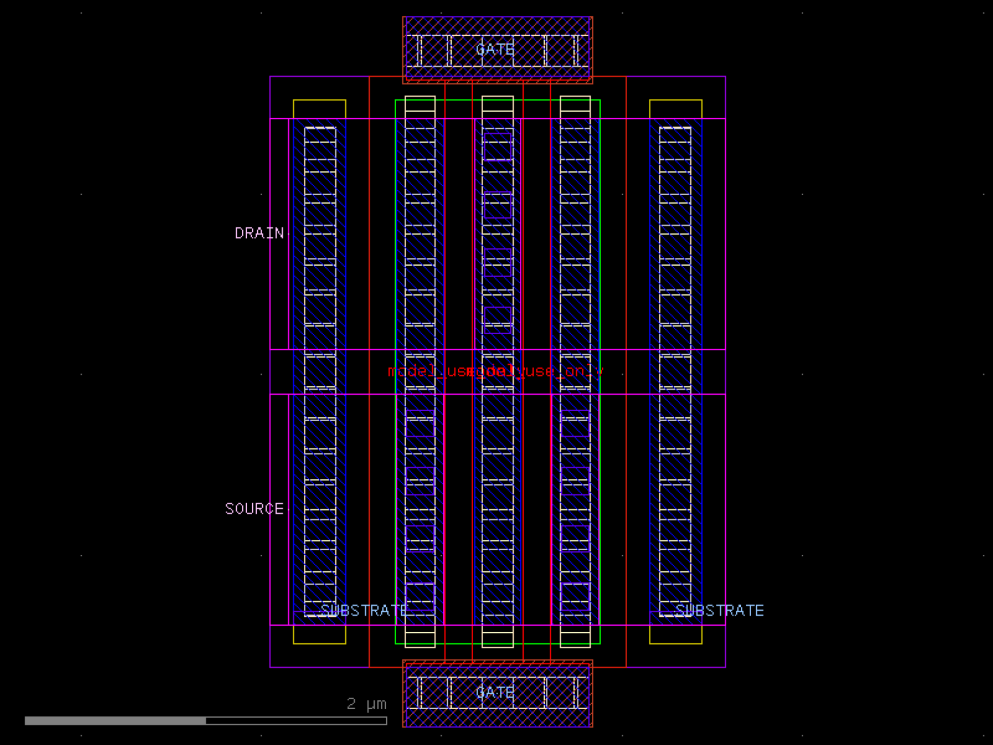 sky130.cells.sky130_fd_pr__rf_nfet_01v8_aM02W3p00L0p15# sky130.cells.sky130_fd_pr__rf_nfet_01v8_aM02W3p00L0p15()[source]# Returns sky130_fd_pr__rf_nfet_01v8_aM02W3p00L0p15 fixed cell. import sky130 c = sky130.components.sky130_fd_pr__rf_nfet_01v8_aM02W3p00L0p15() c.plot() (Source code, png, hires.png, pdf) Return type: Component