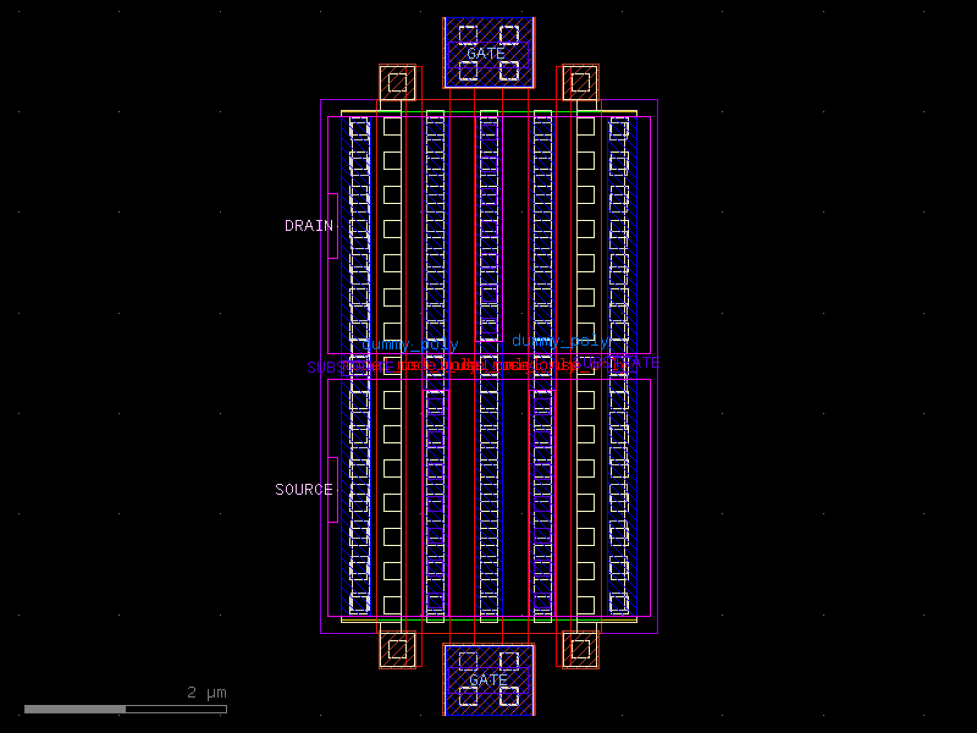 sky130.cells.sky130_fd_pr__rf_nfet_01v8_bM02W5p00L0p25# sky130.cells.sky130_fd_pr__rf_nfet_01v8_bM02W5p00L0p25()[source]# Returns sky130_fd_pr__rf_nfet_01v8_bM02W5p00L0p25 fixed cell. import sky130 c = sky130.components.sky130_fd_pr__rf_nfet_01v8_bM02W5p00L0p25() c.plot() (Source code, png, hires.png, pdf) Return type: Component
