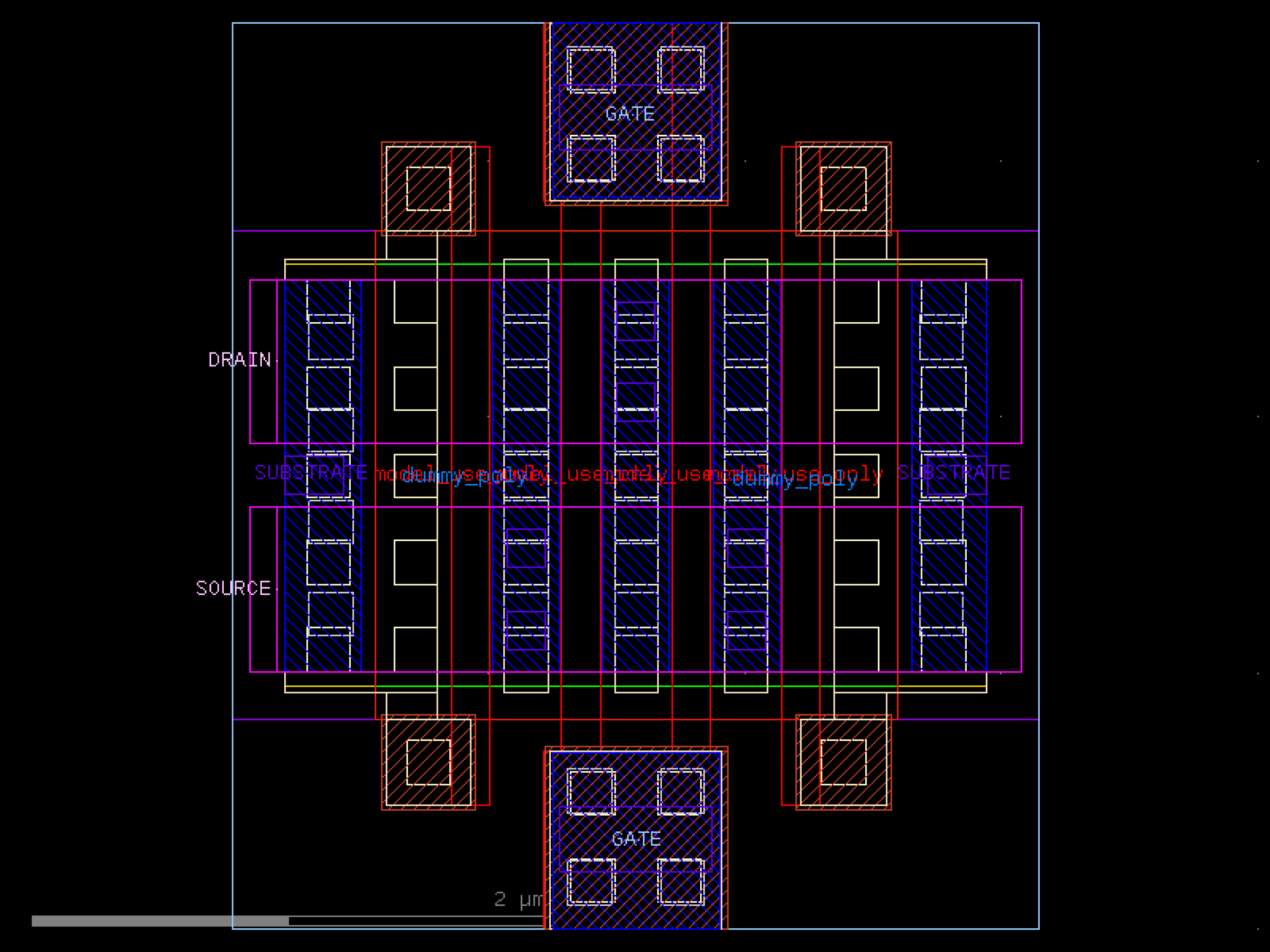 sky130.cells.sky130_fd_pr__rf_nfet_01v8_lvt_bM02W1p65L0p15# sky130.cells.sky130_fd_pr__rf_nfet_01v8_lvt_bM02W1p65L0p15()[source]# Returns sky130_fd_pr__rf_nfet_01v8_lvt_bM02W1p65L0p15 fixed cell. import sky130 c = sky130.components.sky130_fd_pr__rf_nfet_01v8_lvt_bM02W1p65L0p15() c.plot() (Source code, png, hires.png, pdf) Return type: Component