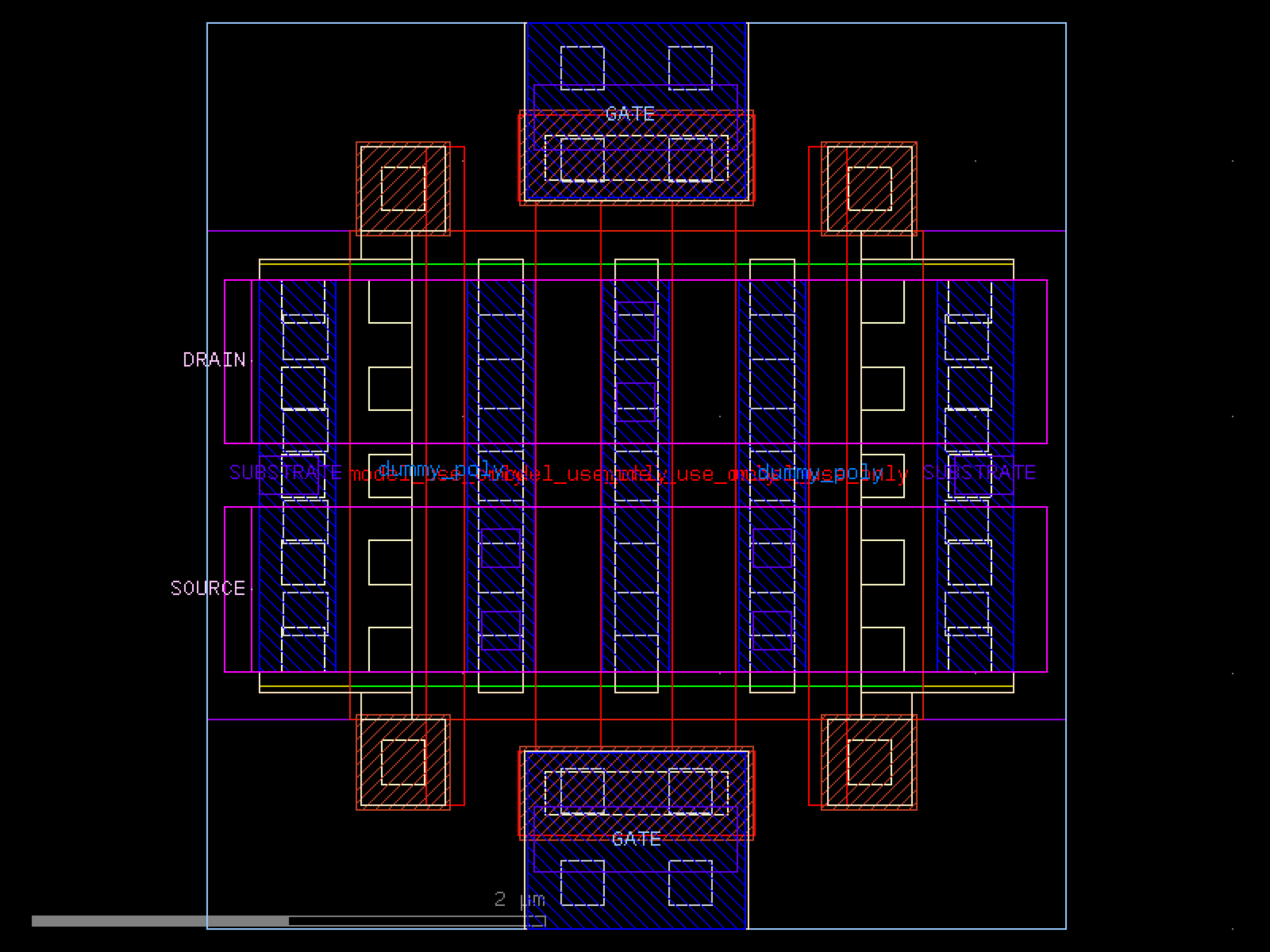 sky130.cells.sky130_fd_pr__rf_nfet_01v8_lvt_cM02W1p65L0p25# sky130.cells.sky130_fd_pr__rf_nfet_01v8_lvt_cM02W1p65L0p25()[source]# Returns sky130_fd_pr__rf_nfet_01v8_lvt_cM02W1p65L0p25 fixed cell. import sky130 c = sky130.components.sky130_fd_pr__rf_nfet_01v8_lvt_cM02W1p65L0p25() c.plot() (Source code, png, hires.png, pdf) Return type: Component