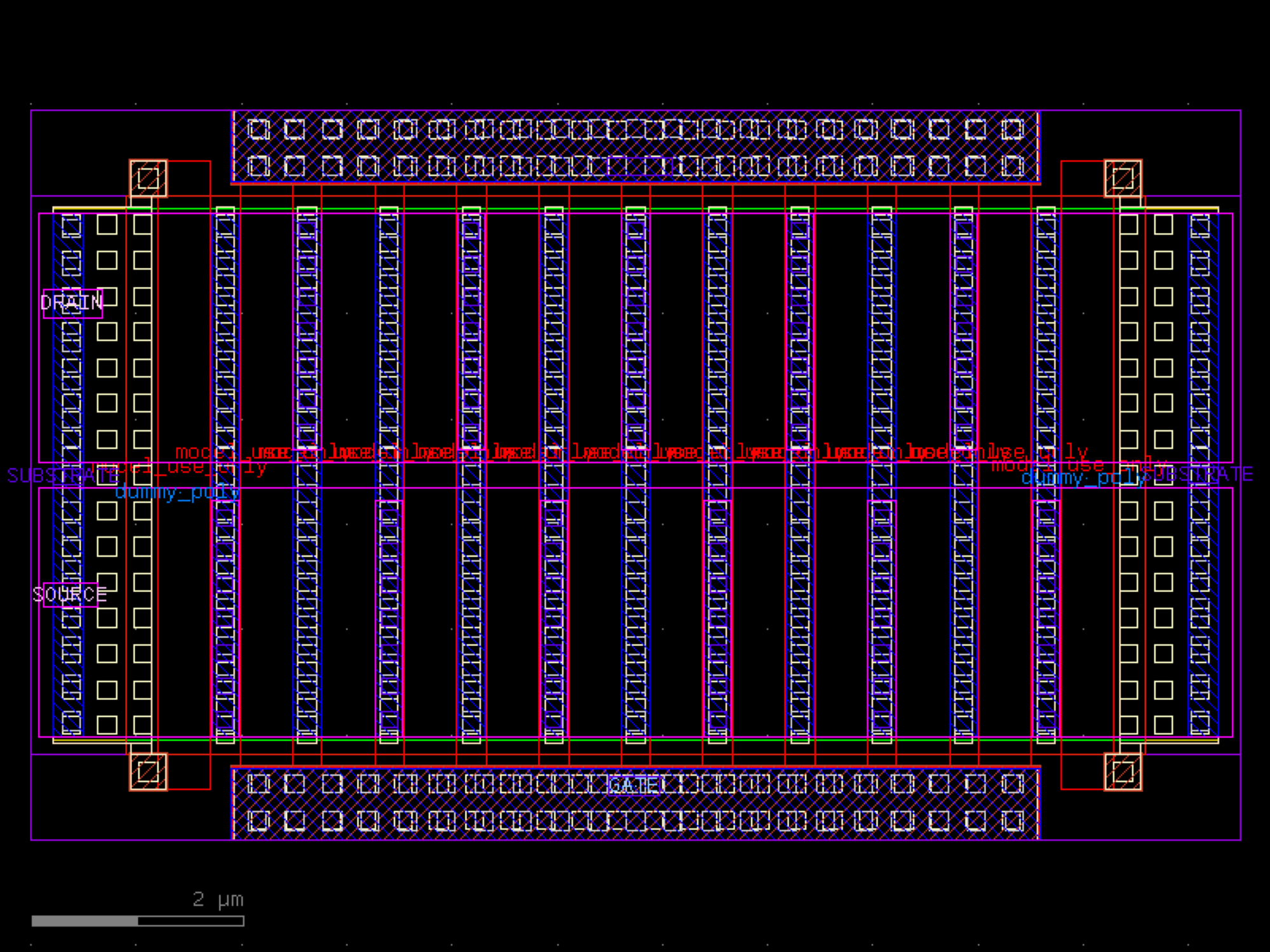 sky130.cells.sky130_fd_pr__rf_nfet_g5v0d10v5_bM10W5p00L0p50# sky130.cells.sky130_fd_pr__rf_nfet_g5v0d10v5_bM10W5p00L0p50()[source]# Returns sky130_fd_pr__rf_nfet_g5v0d10v5_bM10W5p00L0p50 fixed cell. import sky130 c = sky130.components.sky130_fd_pr__rf_nfet_g5v0d10v5_bM10W5p00L0p50() c.plot() (Source code, png, hires.png, pdf) Return type: Component