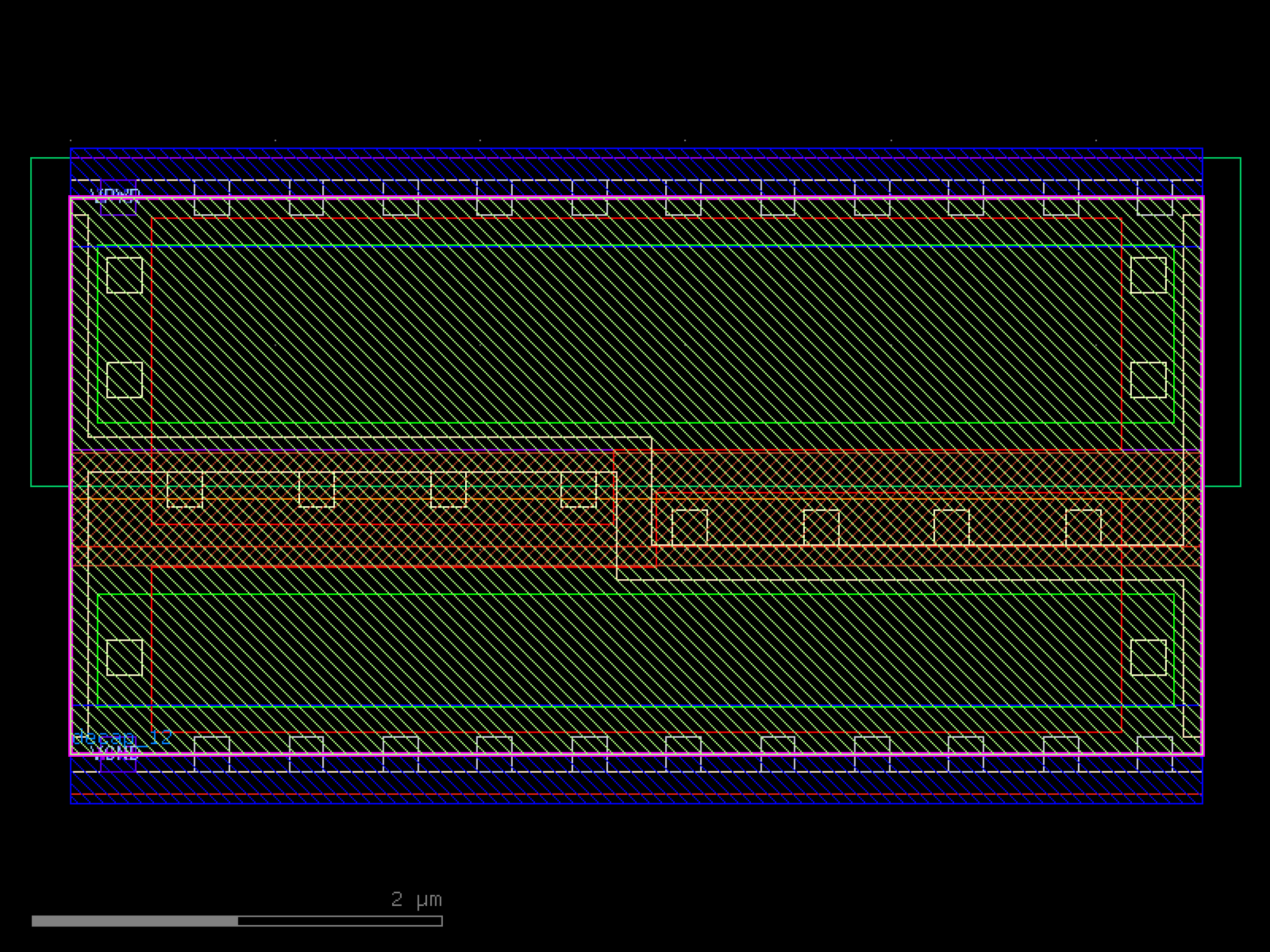 sky130.cells.sky130_fd_sc_hd__decap_12# sky130.cells.sky130_fd_sc_hd__decap_12()[source]# Returns sky130_fd_sc_hd__decap_12 fixed cell. import sky130 c = sky130.components.sky130_fd_sc_hd__decap_12() c.plot() (Source code, png, hires.png, pdf) Return type: Component