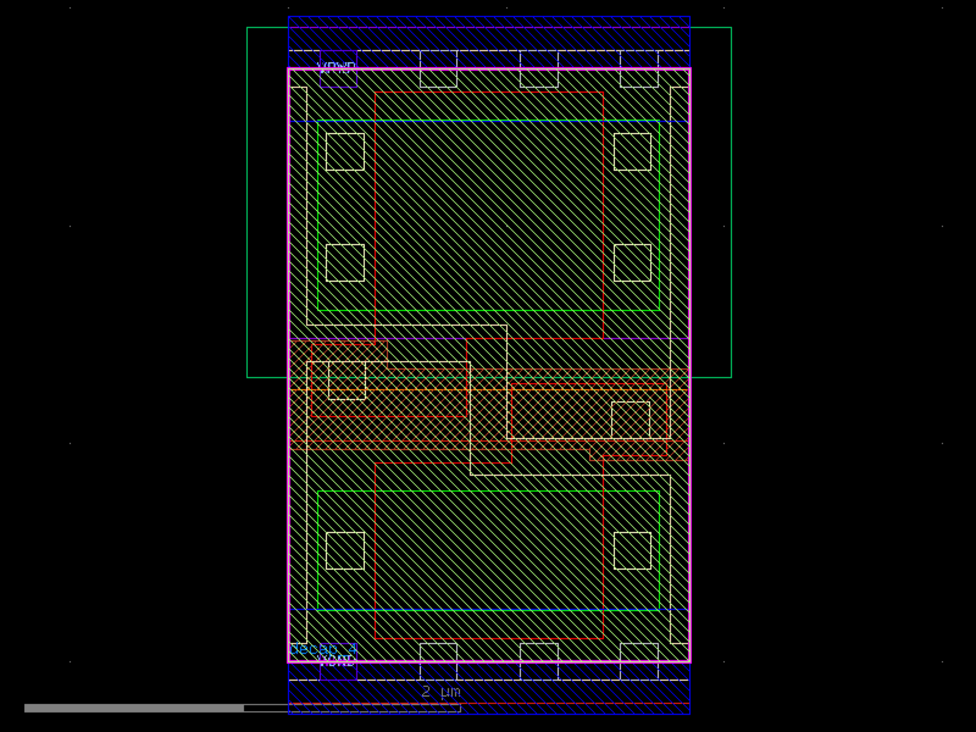 sky130.cells.sky130_fd_sc_hd__decap_4# sky130.cells.sky130_fd_sc_hd__decap_4()[source]# Returns sky130_fd_sc_hd__decap_4 fixed cell. import sky130 c = sky130.components.sky130_fd_sc_hd__decap_4() c.plot() (Source code, png, hires.png, pdf) Return type: Component