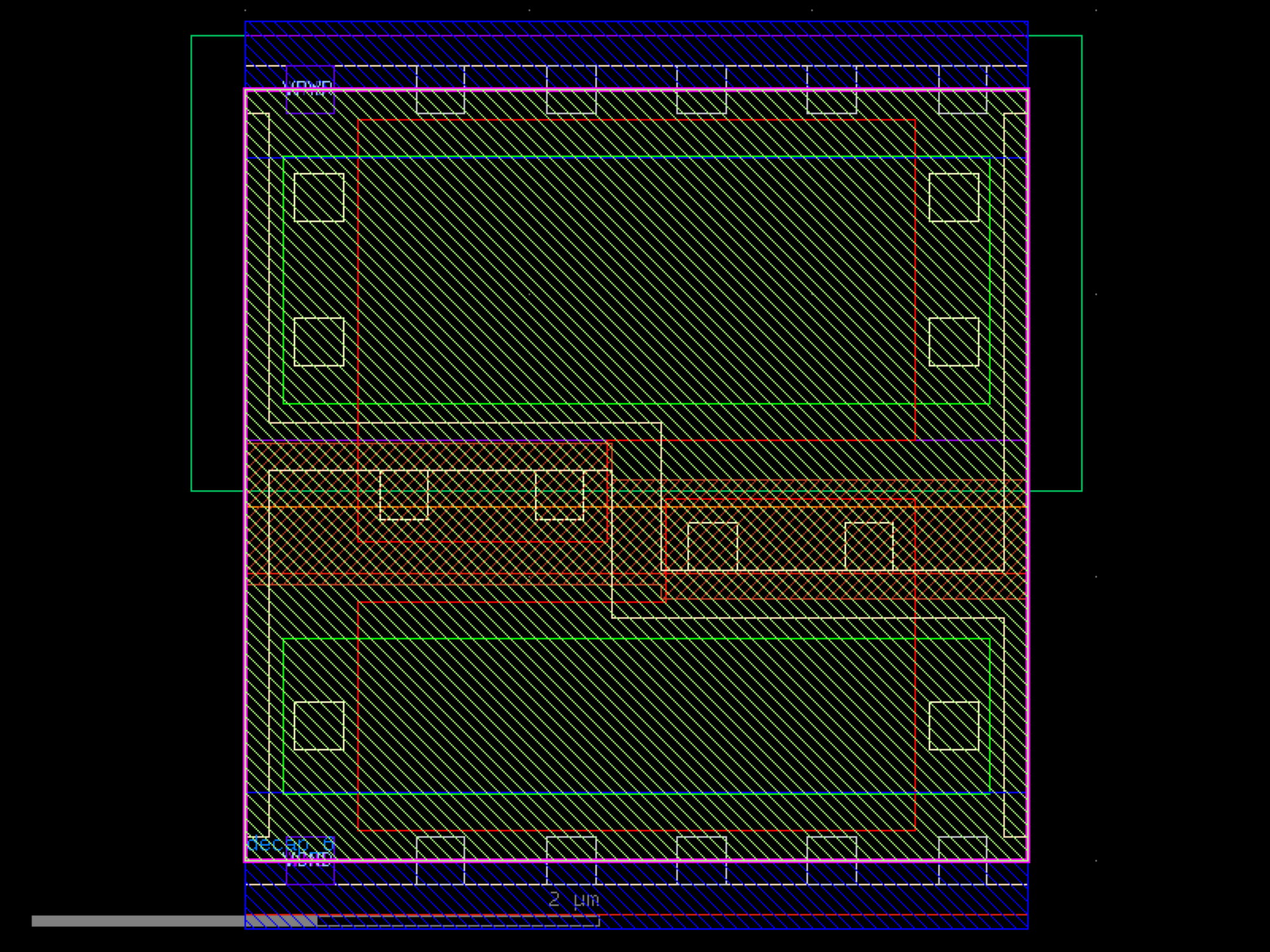 sky130.cells.sky130_fd_sc_hd__decap_6# sky130.cells.sky130_fd_sc_hd__decap_6()[source]# Returns sky130_fd_sc_hd__decap_6 fixed cell. import sky130 c = sky130.components.sky130_fd_sc_hd__decap_6() c.plot() (Source code, png, hires.png, pdf) Return type: Component