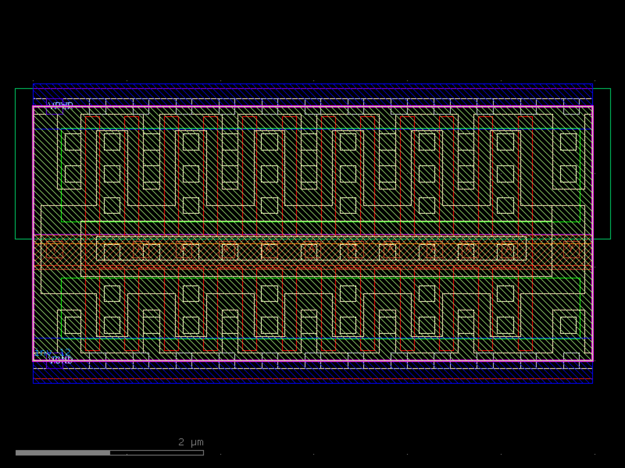 sky130.cells.sky130_fd_sc_hd__inv_12# sky130.cells.sky130_fd_sc_hd__inv_12()[source]# Returns sky130_fd_sc_hd__inv_12 fixed cell. import sky130 c = sky130.components.sky130_fd_sc_hd__inv_12() c.plot() (Source code, png, hires.png, pdf) Return type: Component