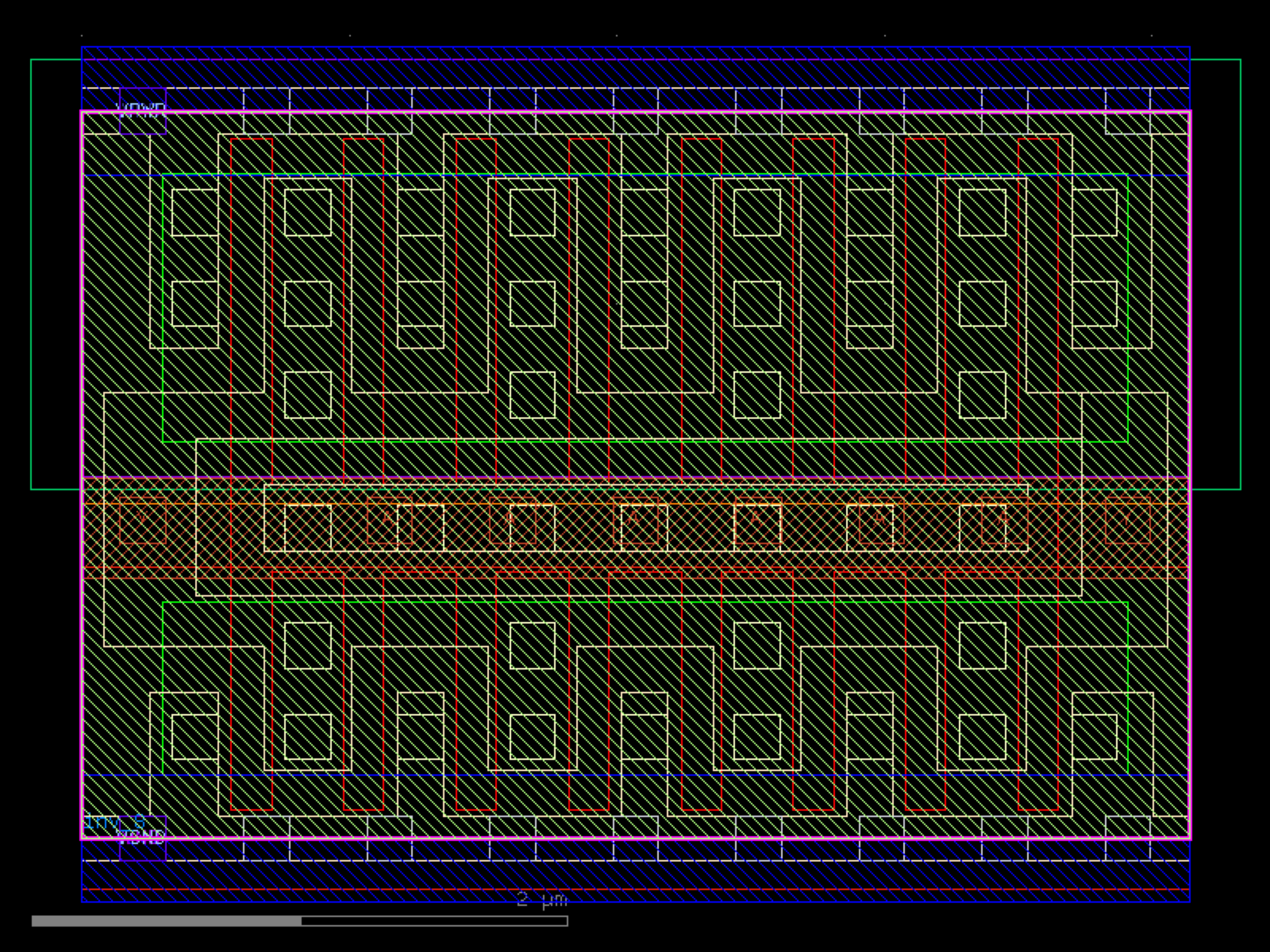sky130.cells.sky130_fd_sc_hd__inv_8# sky130.cells.sky130_fd_sc_hd__inv_8()[source]# Returns sky130_fd_sc_hd__inv_8 fixed cell. import sky130 c = sky130.components.sky130_fd_sc_hd__inv_8() c.plot() (Source code, png, hires.png, pdf) Return type: Component