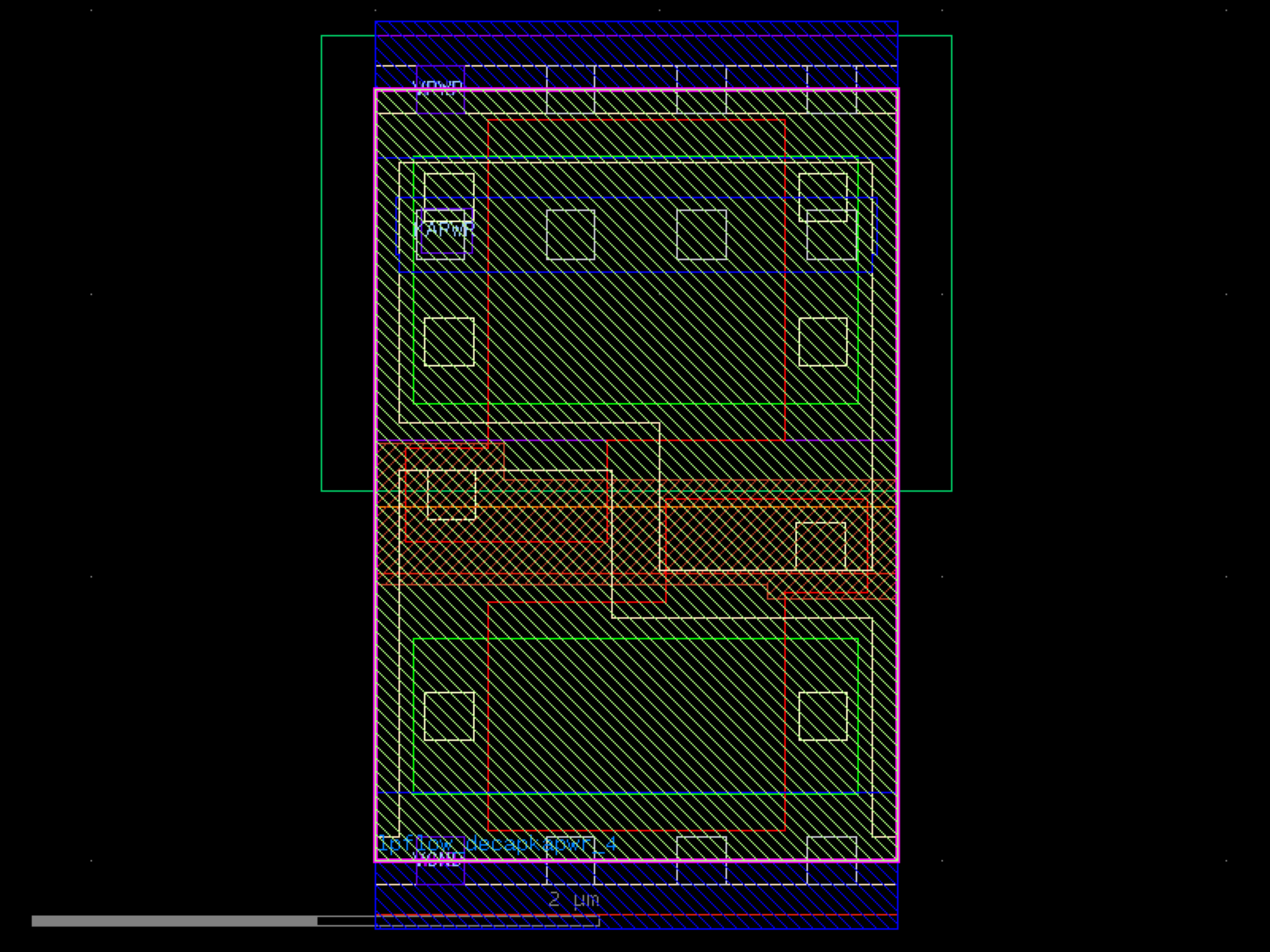 sky130.cells.sky130_fd_sc_hd__lpflow_decapkapwr_4# sky130.cells.sky130_fd_sc_hd__lpflow_decapkapwr_4()[source]# Returns sky130_fd_sc_hd__lpflow_decapkapwr_4 fixed cell. import sky130 c = sky130.components.sky130_fd_sc_hd__lpflow_decapkapwr_4() c.plot() (Source code, png, hires.png, pdf) Return type: Component