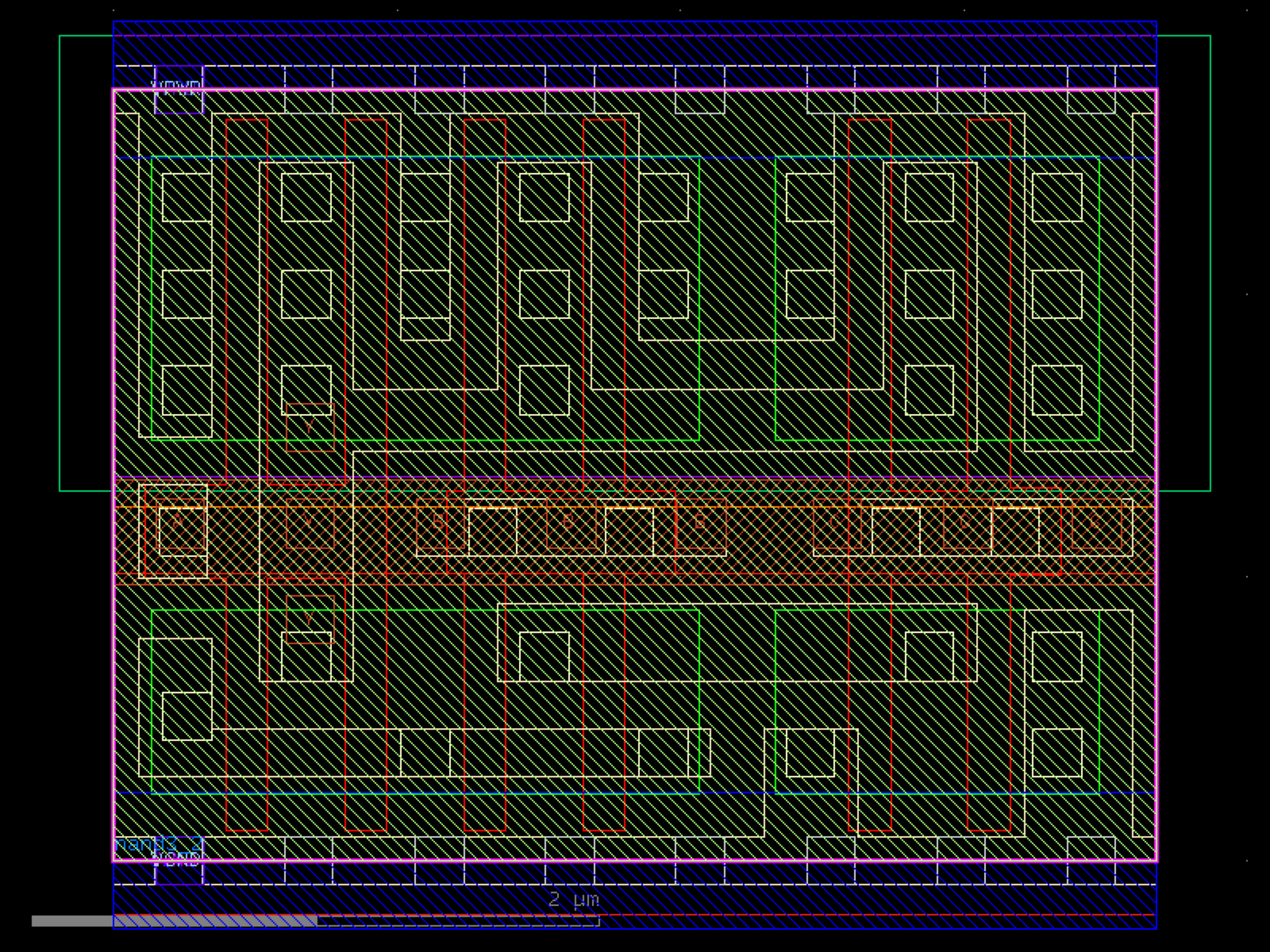 sky130.cells.sky130_fd_sc_hd__nand3_2# sky130.cells.sky130_fd_sc_hd__nand3_2()[source]# Returns sky130_fd_sc_hd__nand3_2 fixed cell. import sky130 c = sky130.components.sky130_fd_sc_hd__nand3_2() c.plot() (Source code, png, hires.png, pdf) Return type: Component